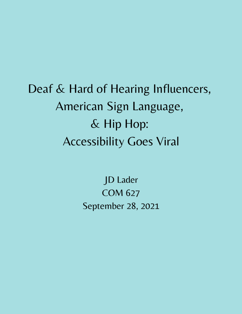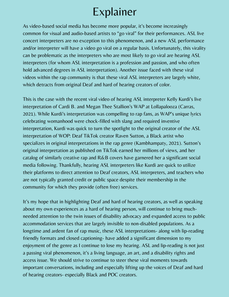 This multimedia project examines the viral phenomenon of ASL (American Sign Language) interpreters at live concerts and festivals and the intersectionality of disability rights, disability access, Deaf and hard of hearing content creators, social justice, and hip hop. You may download the project explainer by clicking on this link.